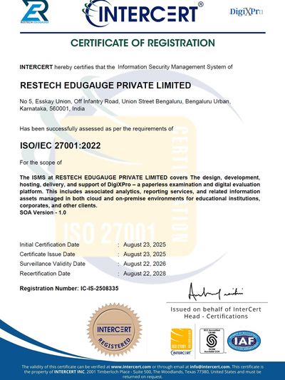 We are proud to announce that Restech Edugauge, the company behind our flagship product DigiXPro, has achieved ISO/IEC 27001:2022 certification, the world’s leading standard for Information Security Management Systems (ISMS). This certification reflects our commitment to upholding the highest global standards of information security, risk management, and compliance. It ensures that the data entrusted to us—by students, educators, and institutions—is managed with utmost confidentiality, integrity, and availability.